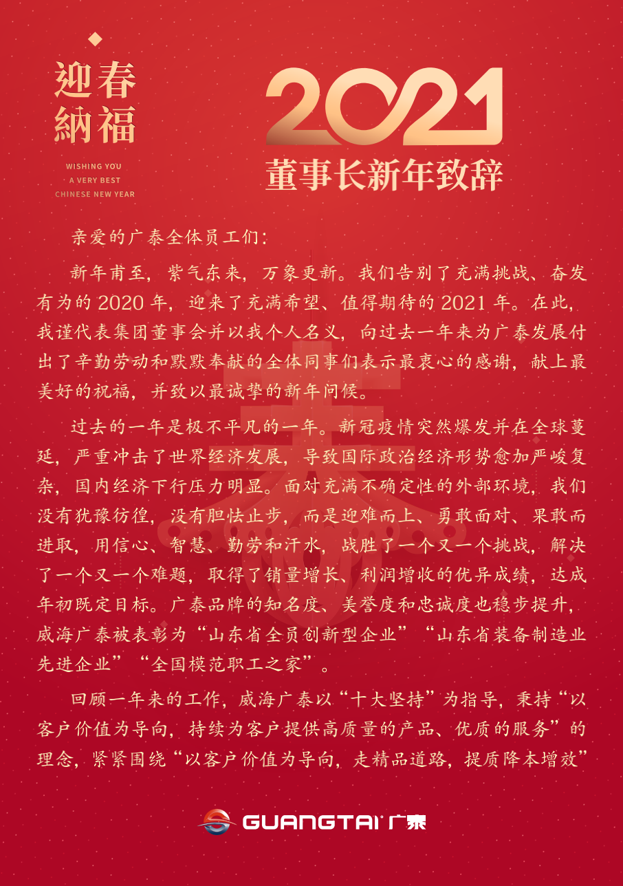 “感動”與“最美”觸動心靈;“目標”和“囑托”催人奮進。回首2020,新冠疫情突然爆發(fā)并在全球蔓延,廣泰集團科學防控疫情,嚴密組織復(fù)工復(fù)產(chǎn),以“十大堅持”為綱,以技術(shù)創(chuàng)新為龍頭,以客戶價值為導(dǎo)向,走精品道路,提質(zhì)降本增效,打造智能化高端保障裝備制造平臺,實現(xiàn)集團高質(zhì)…