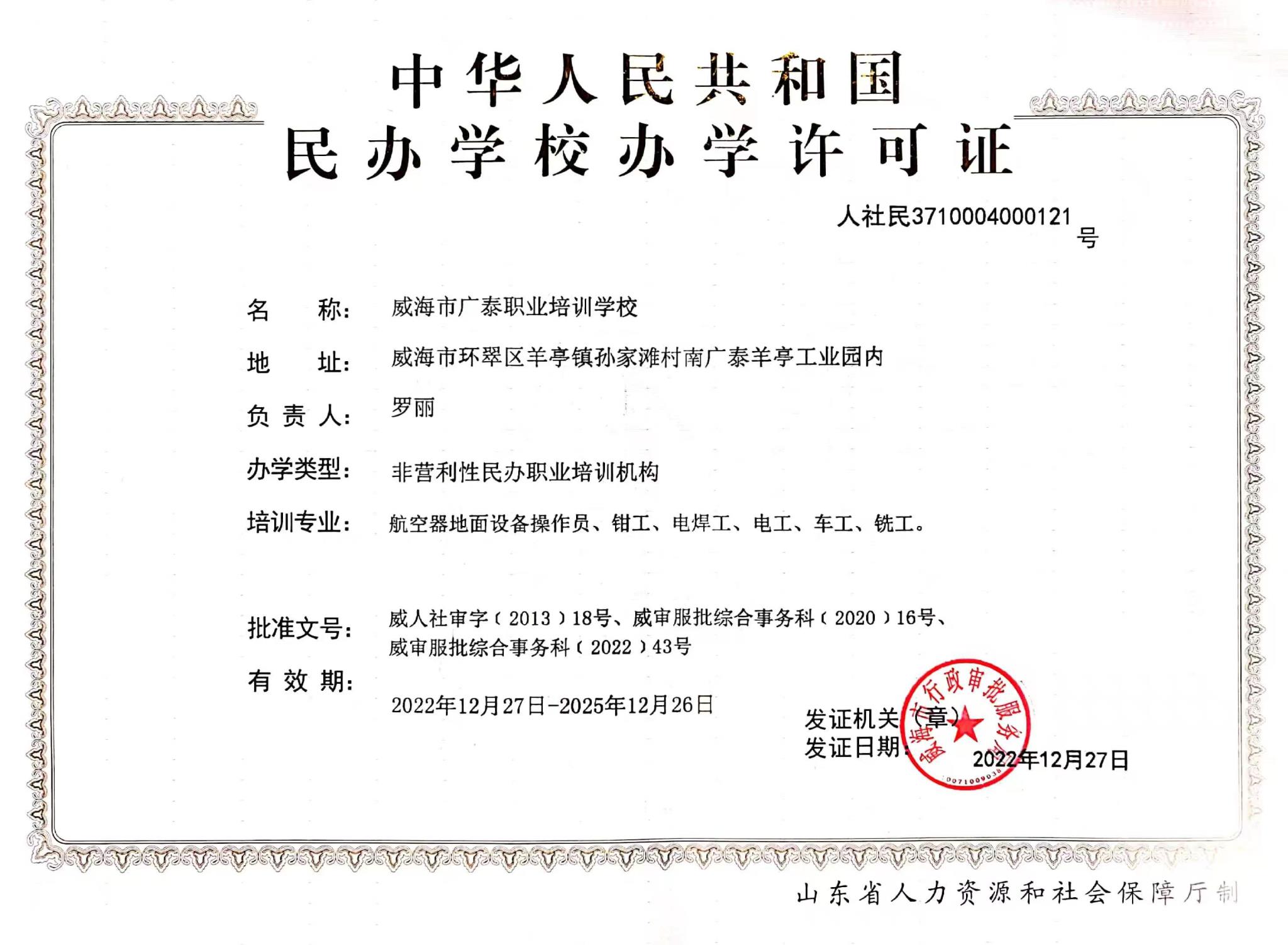 威海廣泰職業培訓學校成立于2013年,由威海廣泰空港設備股份有限公司全資設立。 學校位于威海市環翠區羊亭鎮惠河路93號,是經威海市人力資源和社會保障局批準成立的職業培訓機構,具有民航特種車輛操作工、民航特種車輛機械維修工、民航特種車輛電氣維修工、鉗工、電工、焊工、車工、銑工、涂裝工、計算機操作員等工種的初、中、高級職業技能培訓資質。學校致力于成為民航業內專業的技能提升培訓服務機構,堅持“教練結合、寓教于練”的培訓理念,為學員提供優質的培訓服務。